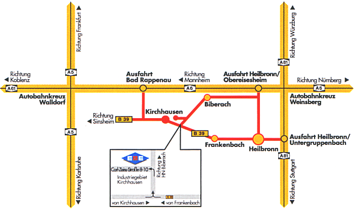 Von Süden über die A 81 bis zum Autobahnkreuz Weinsberg, dort auf die A 6 Richtung Mannheim / Abfahrt Untereisesheim. An der Abfahrt links, 1 Ampel wieder links, dann der Straße (ausgeschildert) bis HN-Biberach folgen. In Ortsmitte Richtung HN-Kirchhausen, durch den Ort fahren, über die Autobahnbrücke und dann rechts in das Industriegebiet Konradsberg einbiegen. |